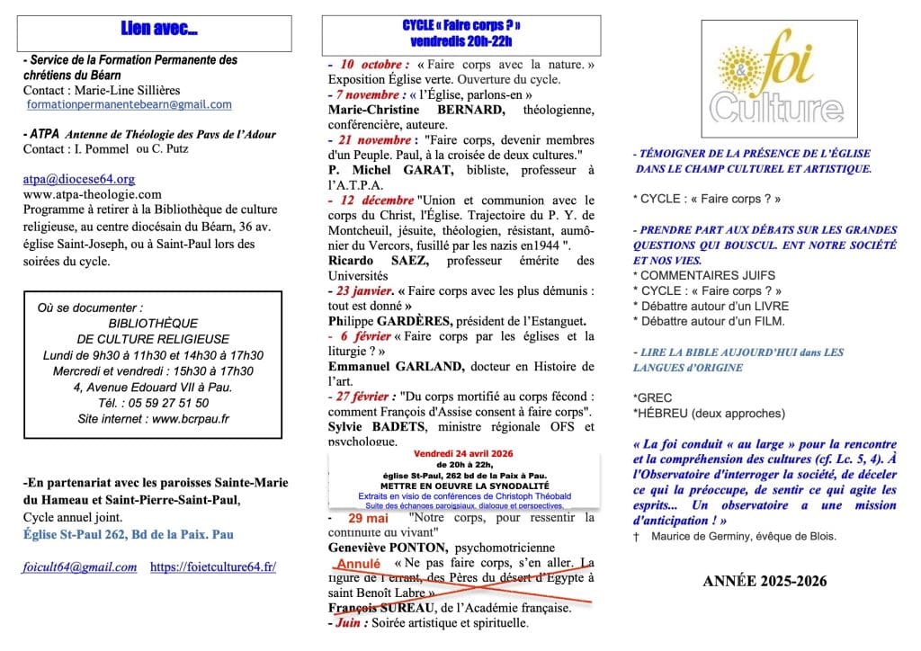 Dans notre diocèse Foi et Culture 64. Saison 25-26 dès le 10 octobre, pour un nouveau cycle de vendredis sur le thème « Faire corps ? »